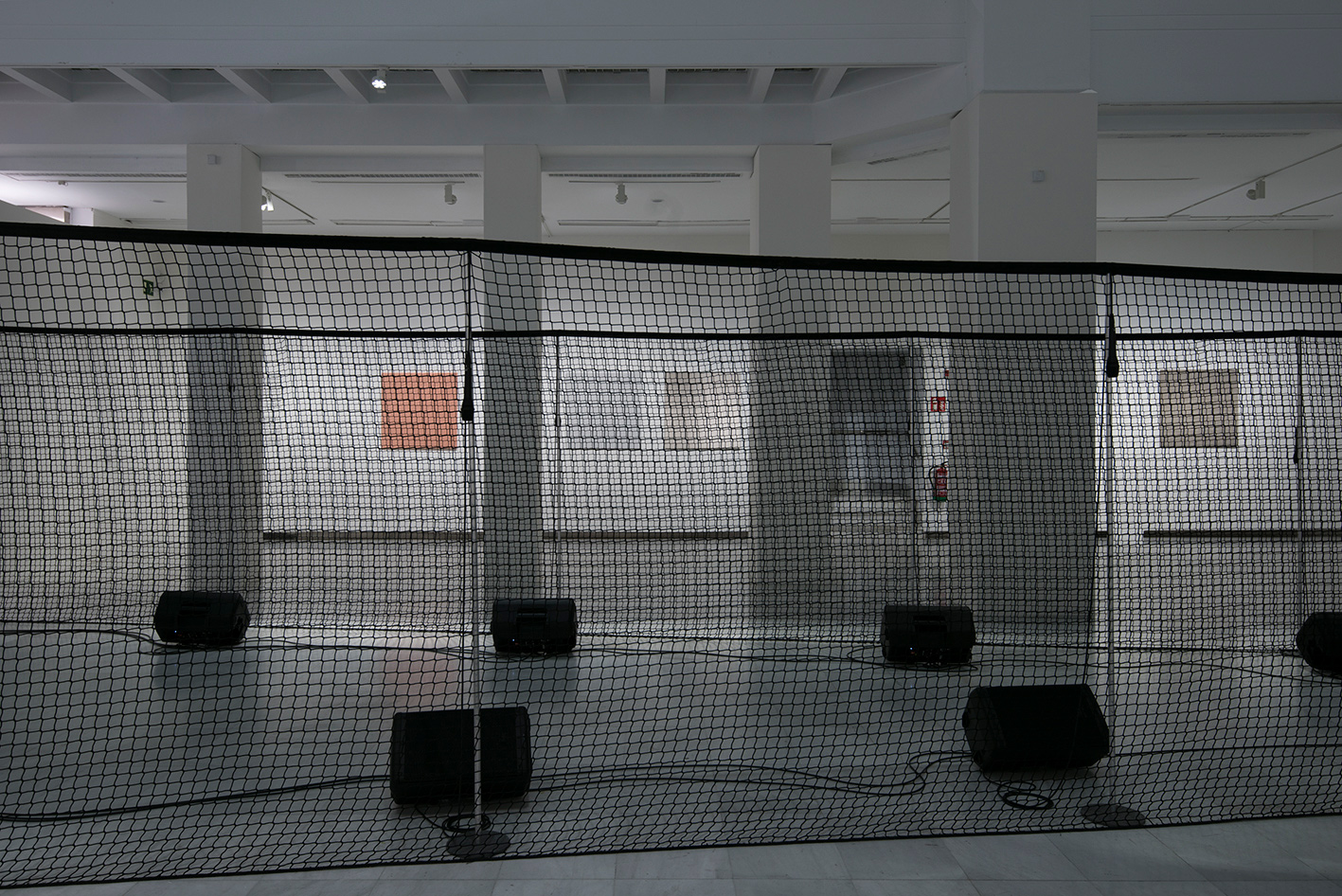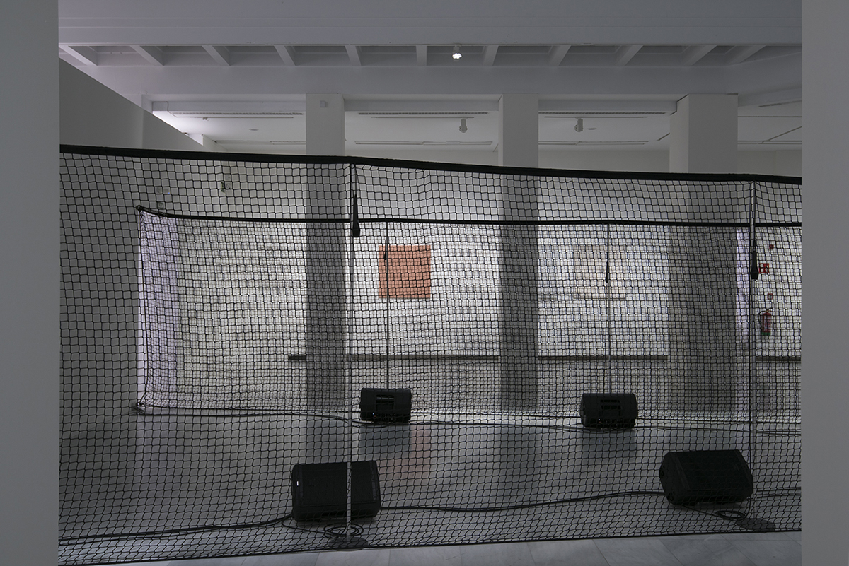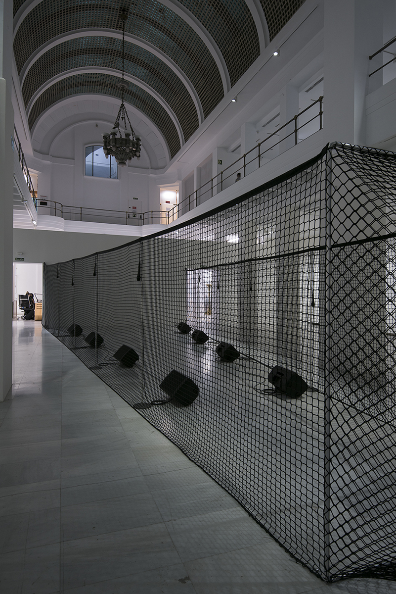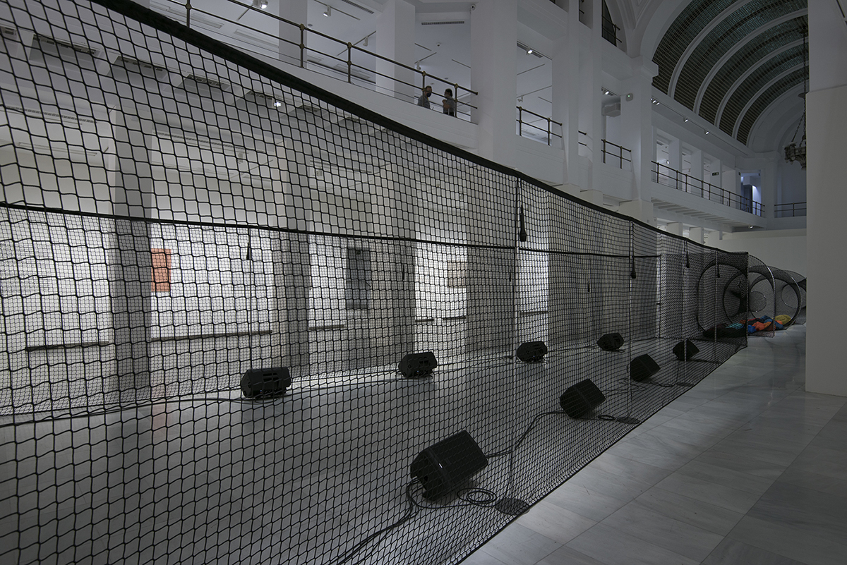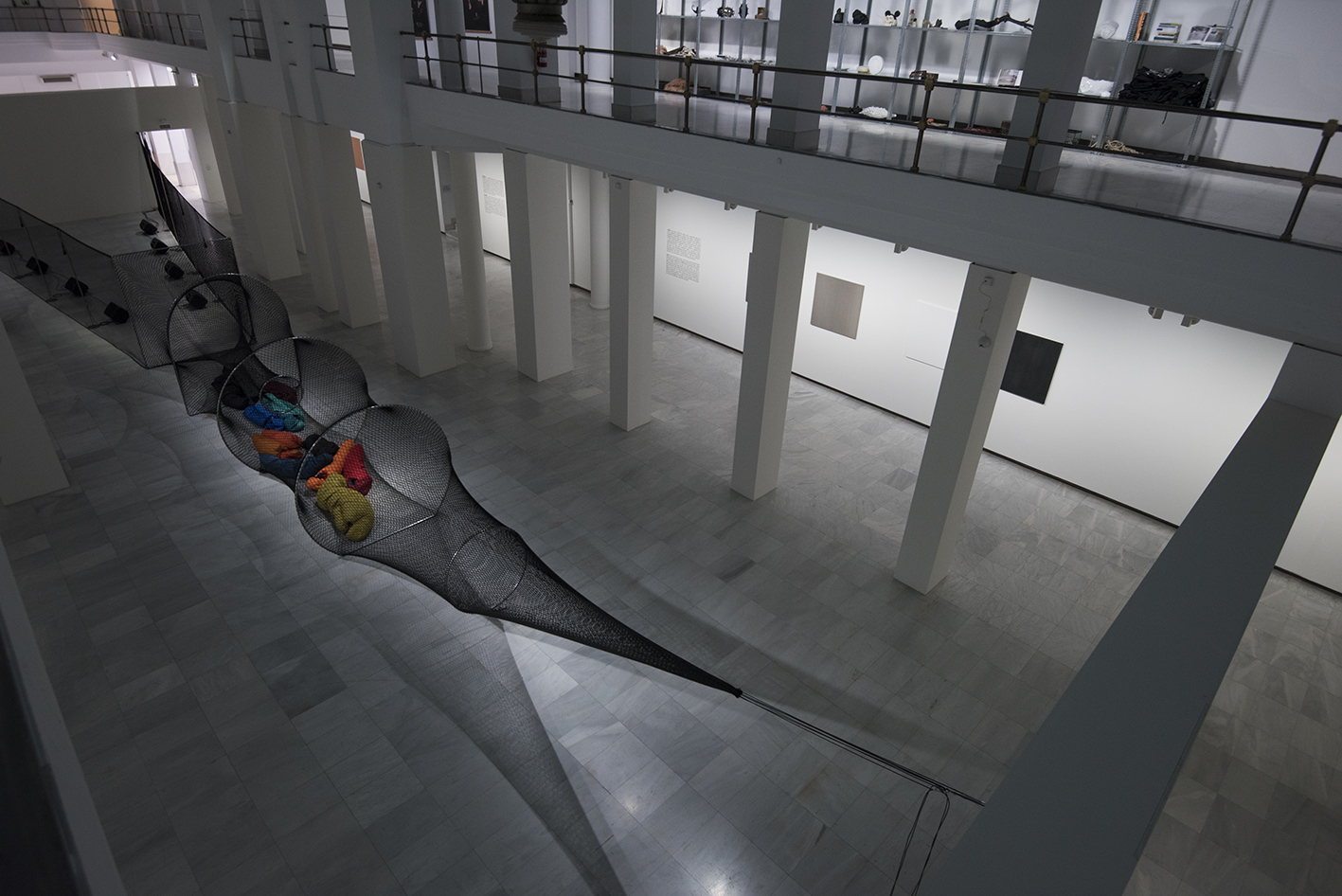 In the central space on the first floor there was a large installation, «Welfare Trap», consisting of a human-scale fishing trap where the metallic structures are access doors with shapes that go through the history of the architectural span, from the square to the circle, passing through the semicircular arch. This piece was accompanied by a sound installation made up of microphones with which the public could interact.