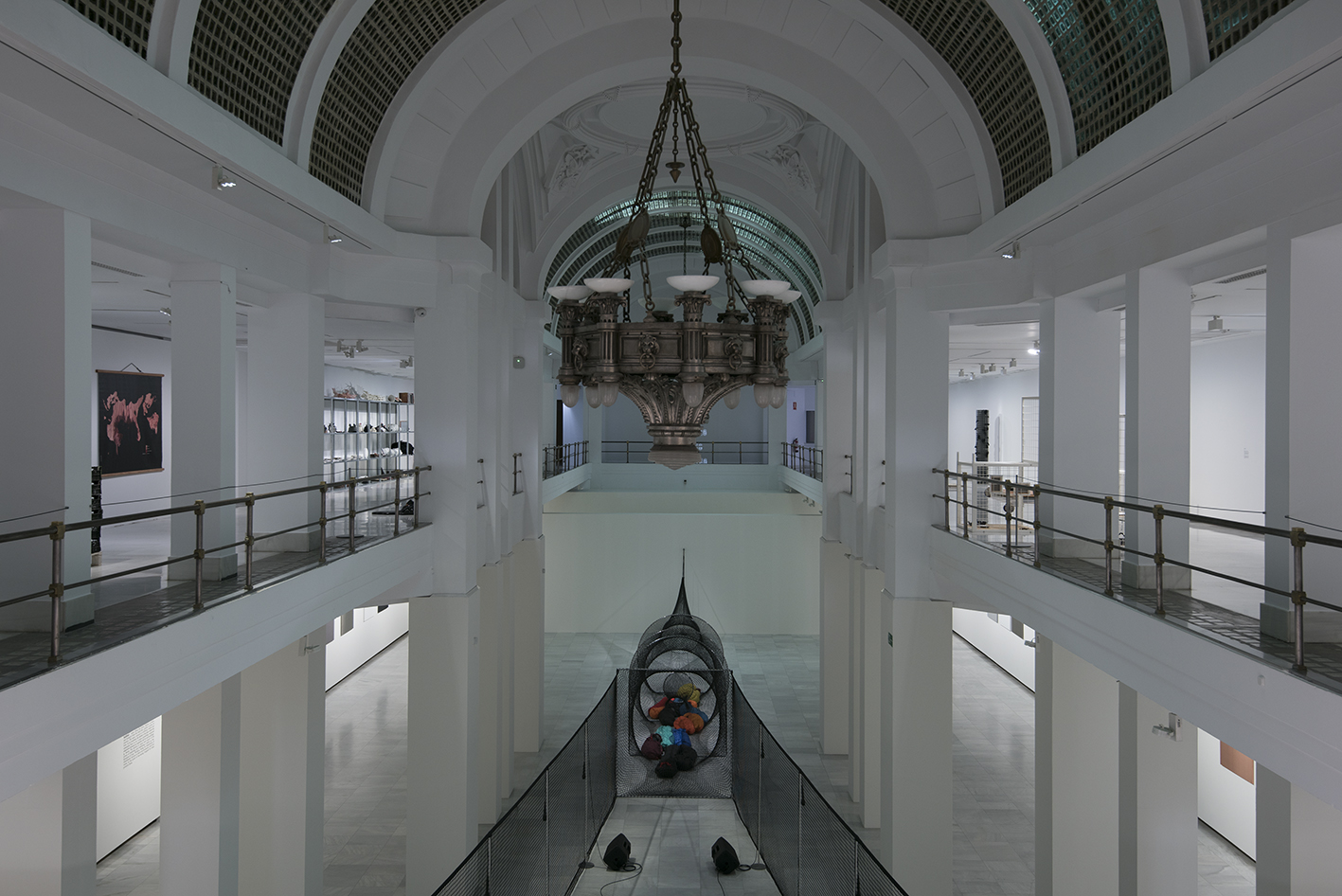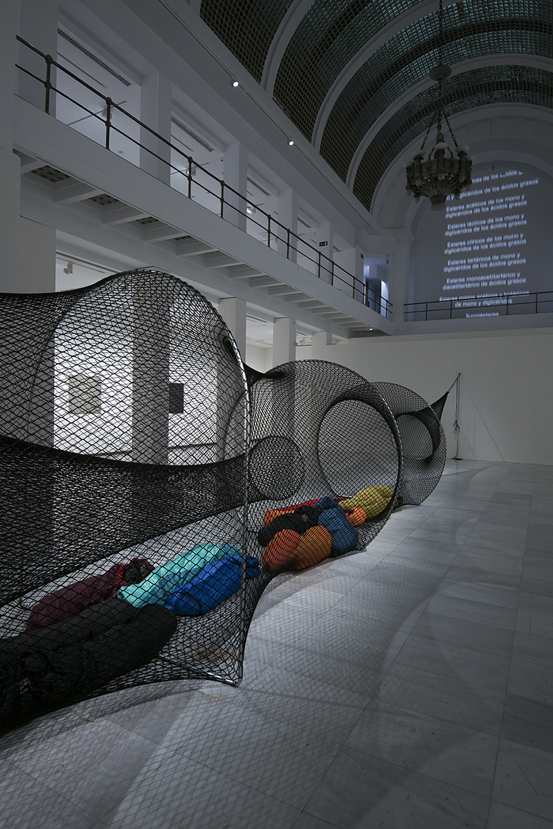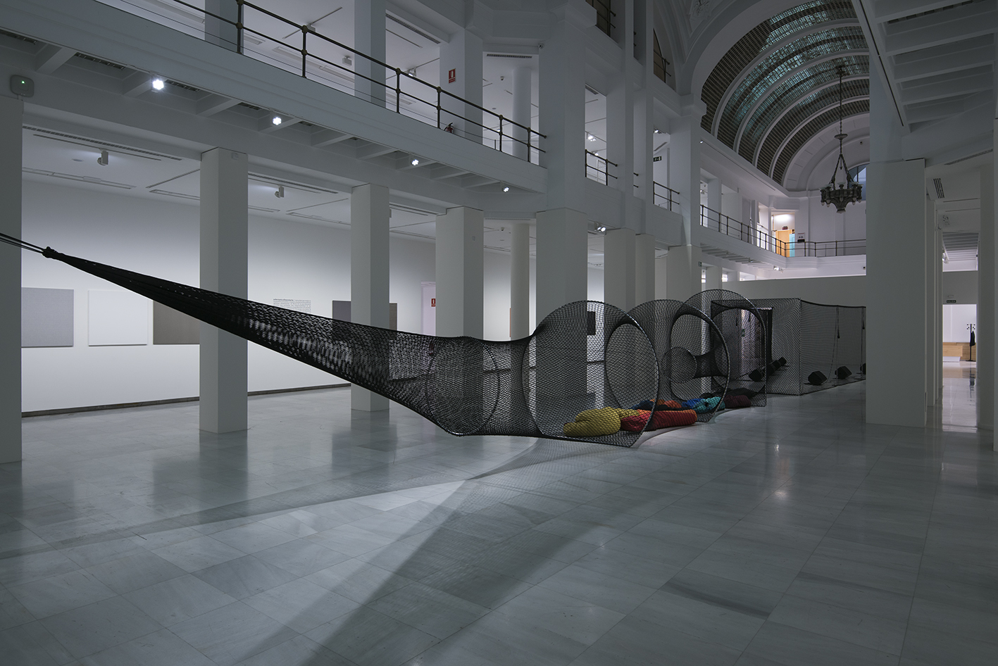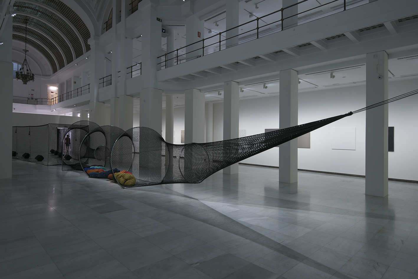 In the central space on the first floor there was a large installation, «Welfare Trap», consisting of a human-scale fishing trap where the metallic structures are access doors with shapes that go through the history of the architectural span, from the square to the circle, passing through the semicircular arch. This piece was accompanied by a sound installation made up of microphones with which the public could interact.