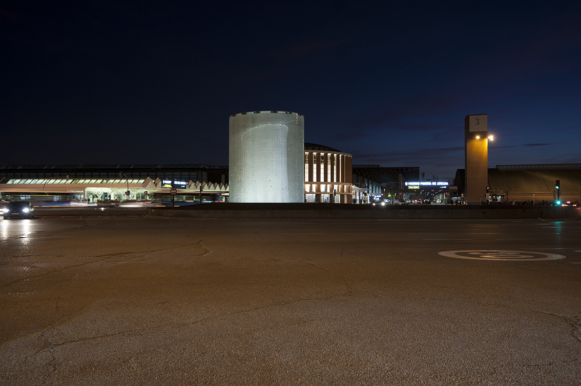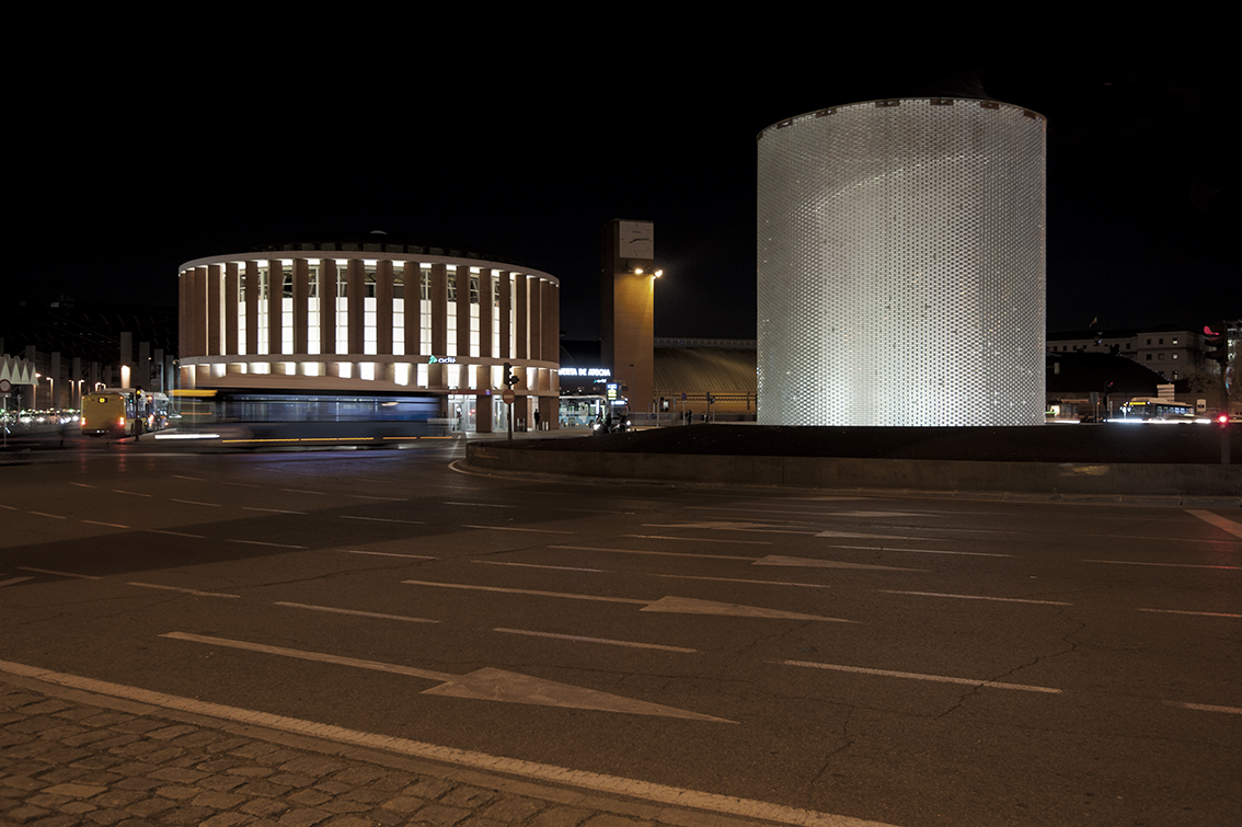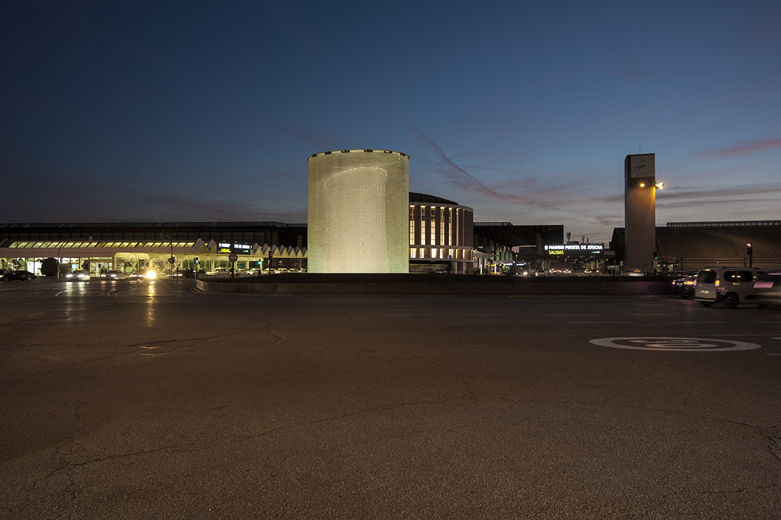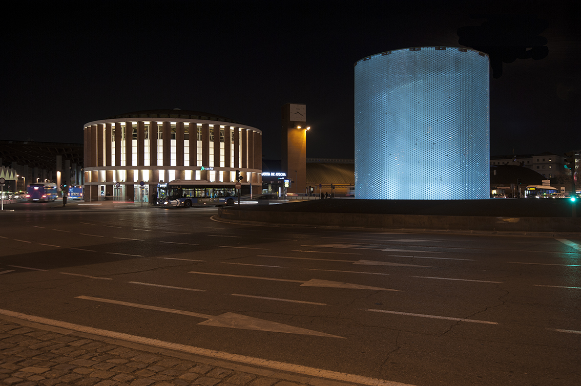 Apart from significantly reducing the power used, a perimeter metal ring was installed under the glass roof as a reflective surface which, in addition to reducing lighting pollution, returns much of the luminous flux towards the inside, thus achieving a uniform value throughout the lateral development of the cylindrical shape and a correct perception of the interior shape that contains the graphics. The design of the dynamic lighting sequences was carried out by María Gil de Montes and the programming by César Linares.