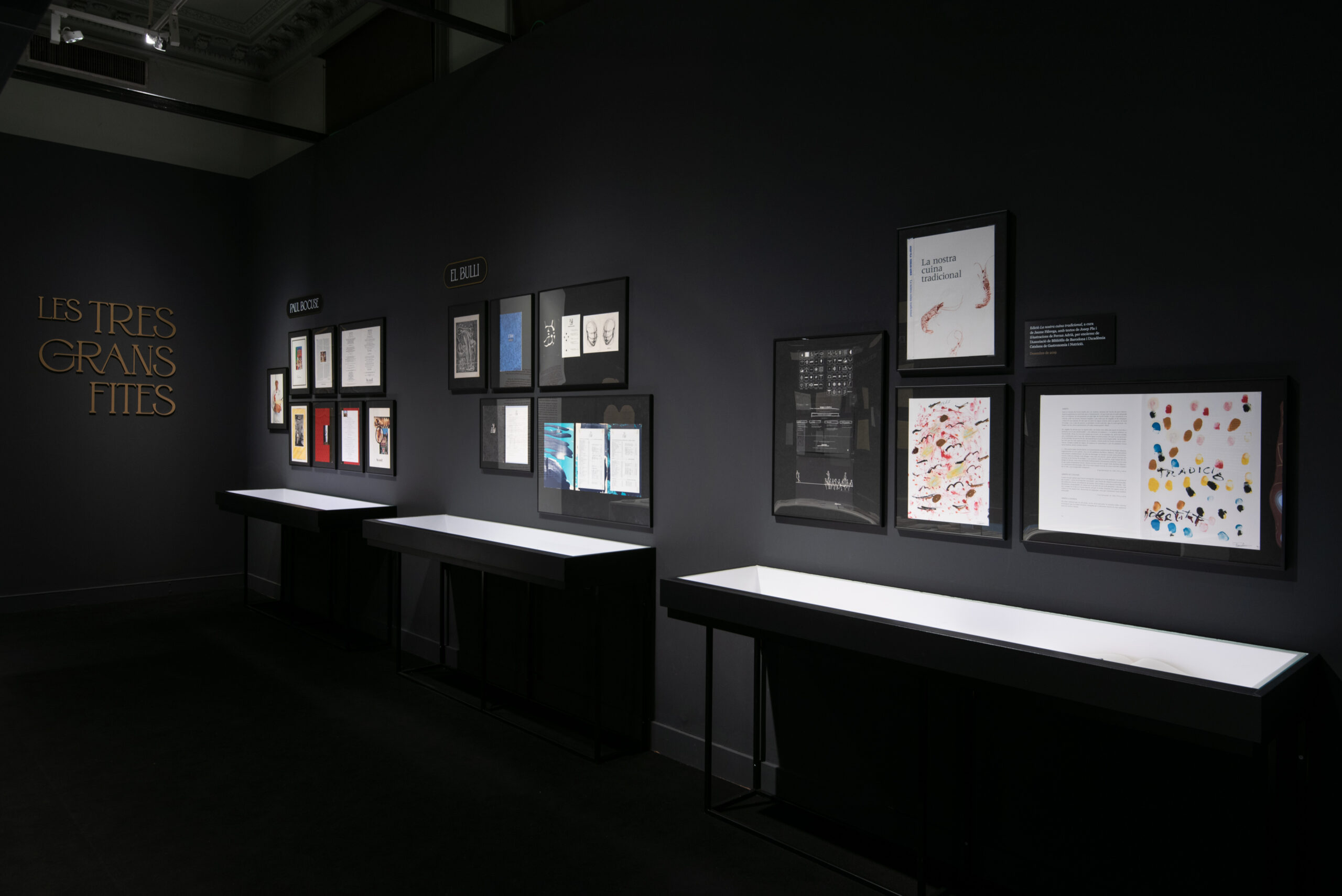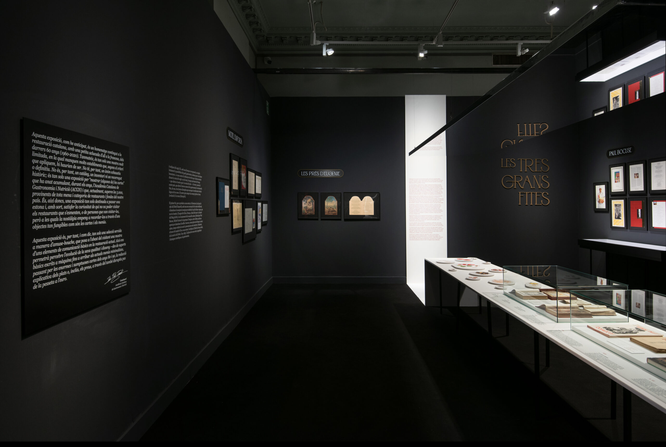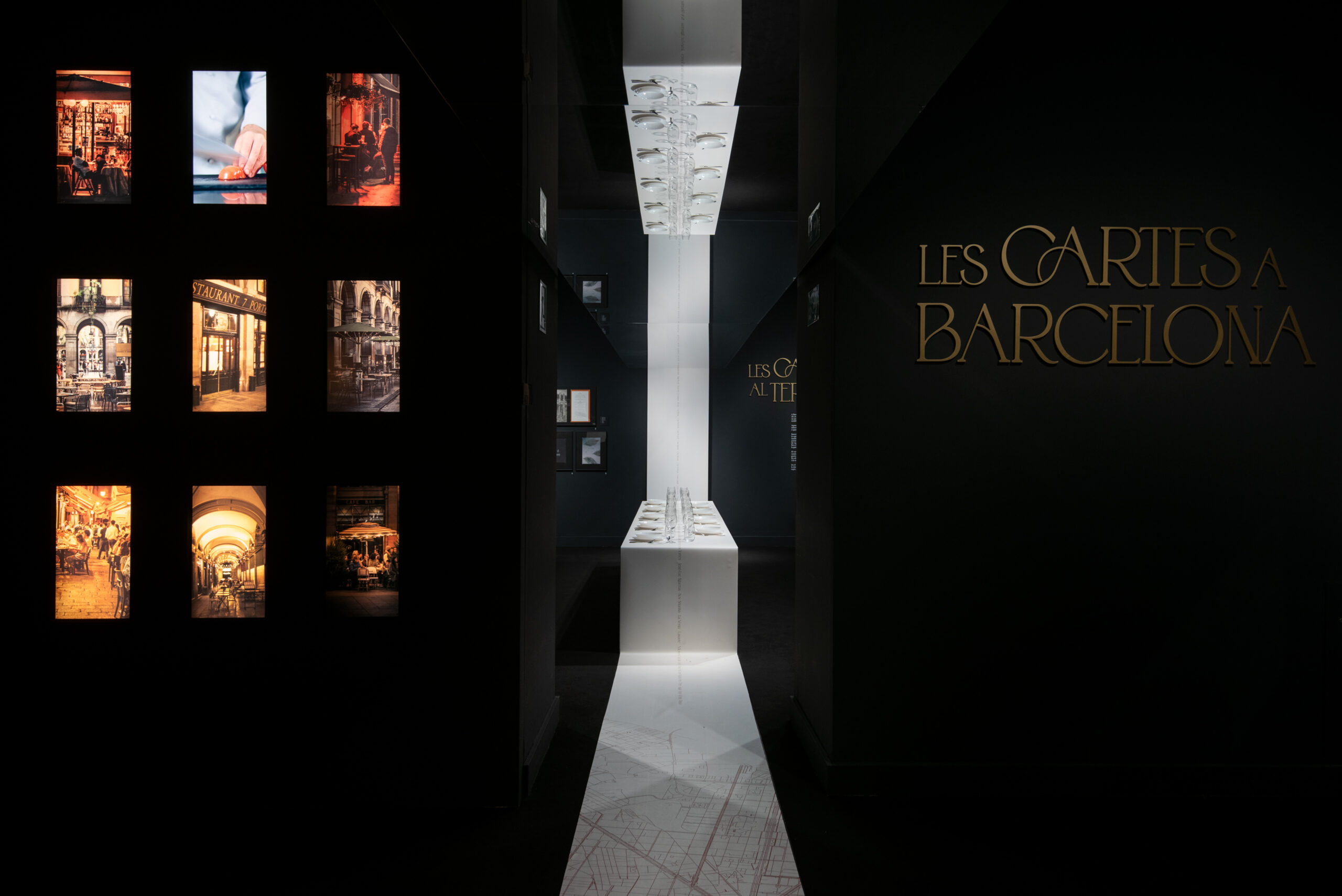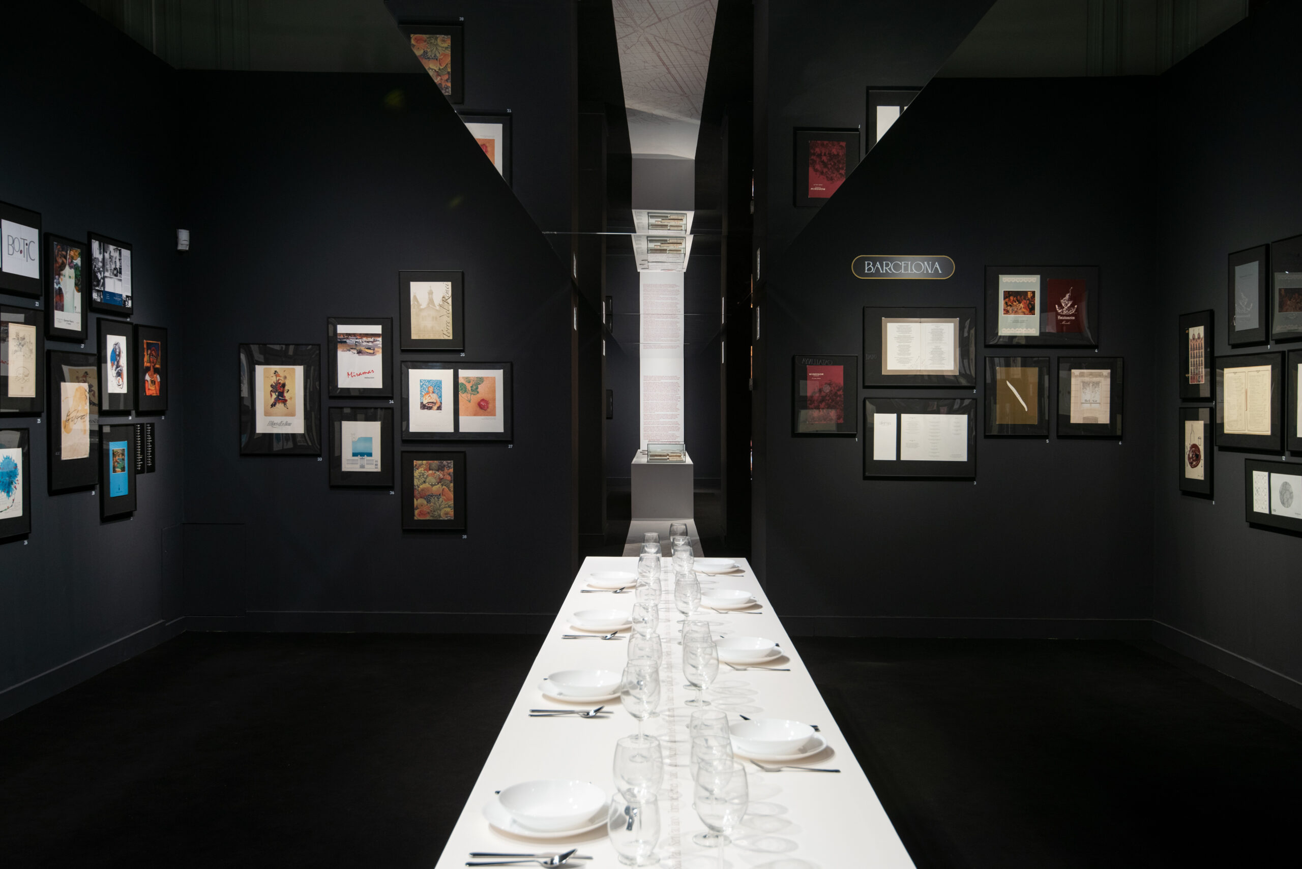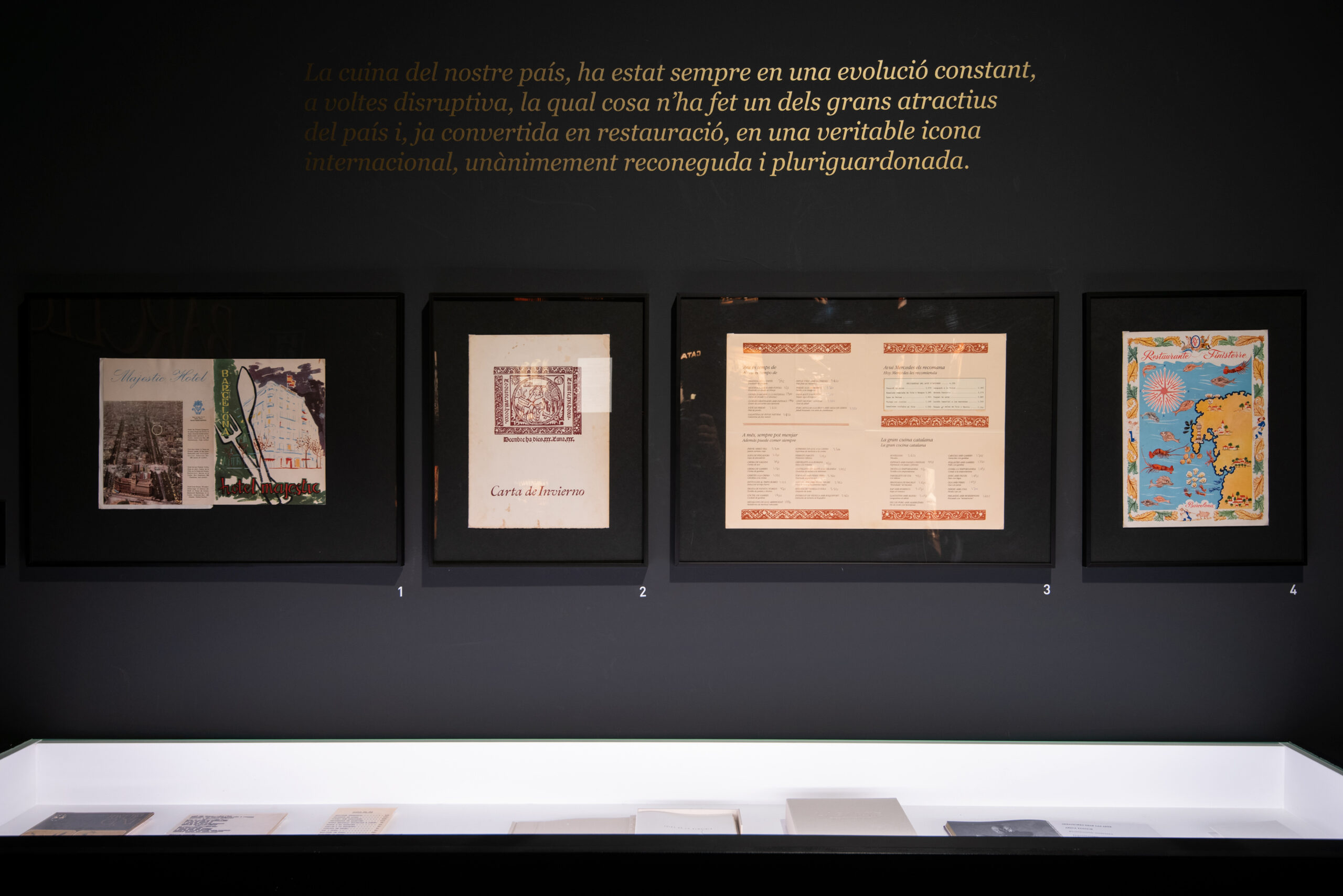 Diseño museográfico de la exposición en Palau Robert que ofrece un recorrido histórico por la gastronomía catalana mediante cartas de restaurante representativas desde principios del siglo XX hasta la actualidad.