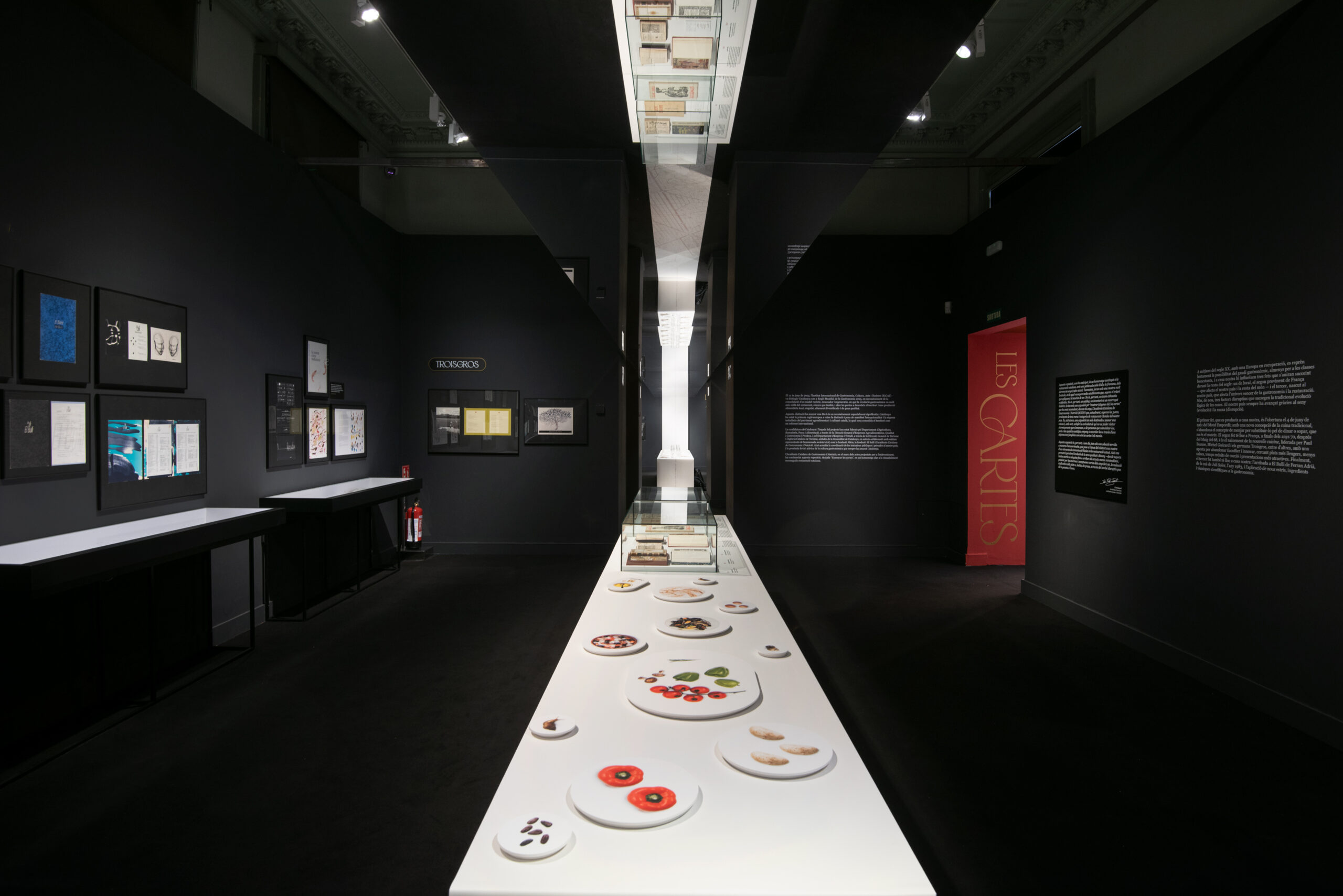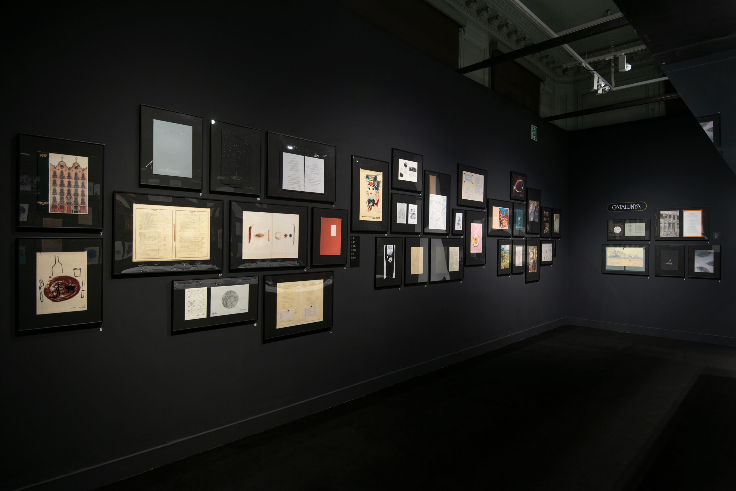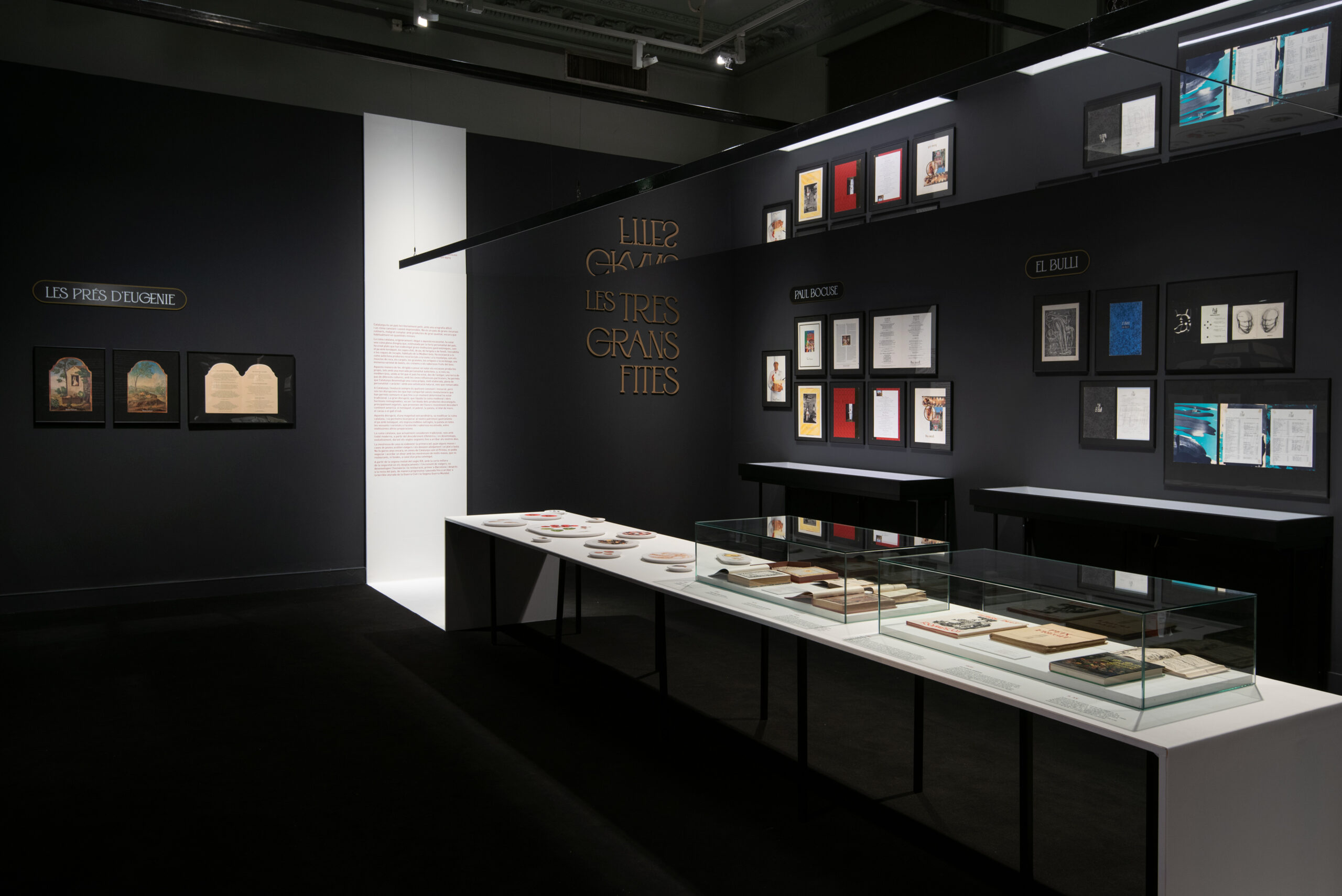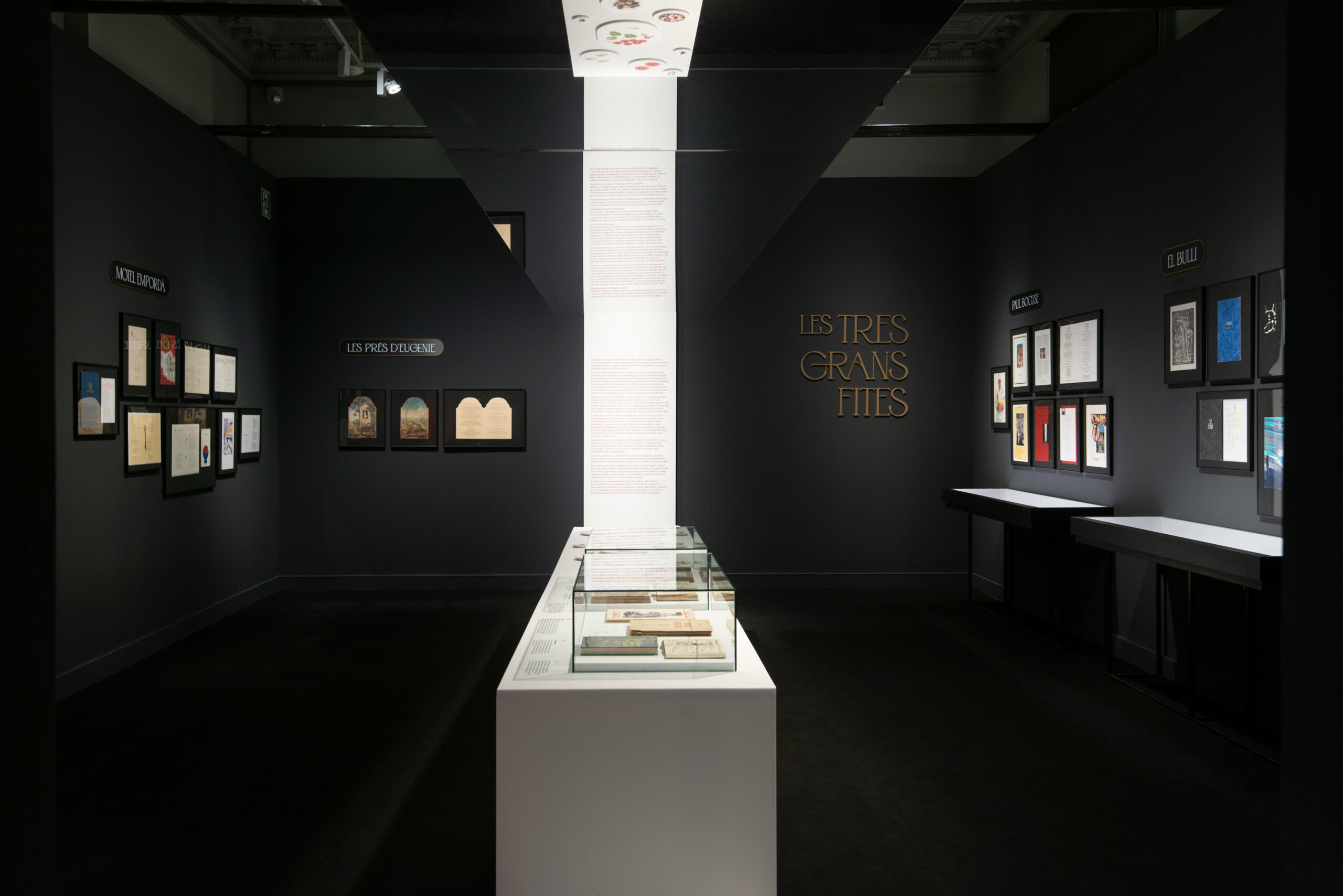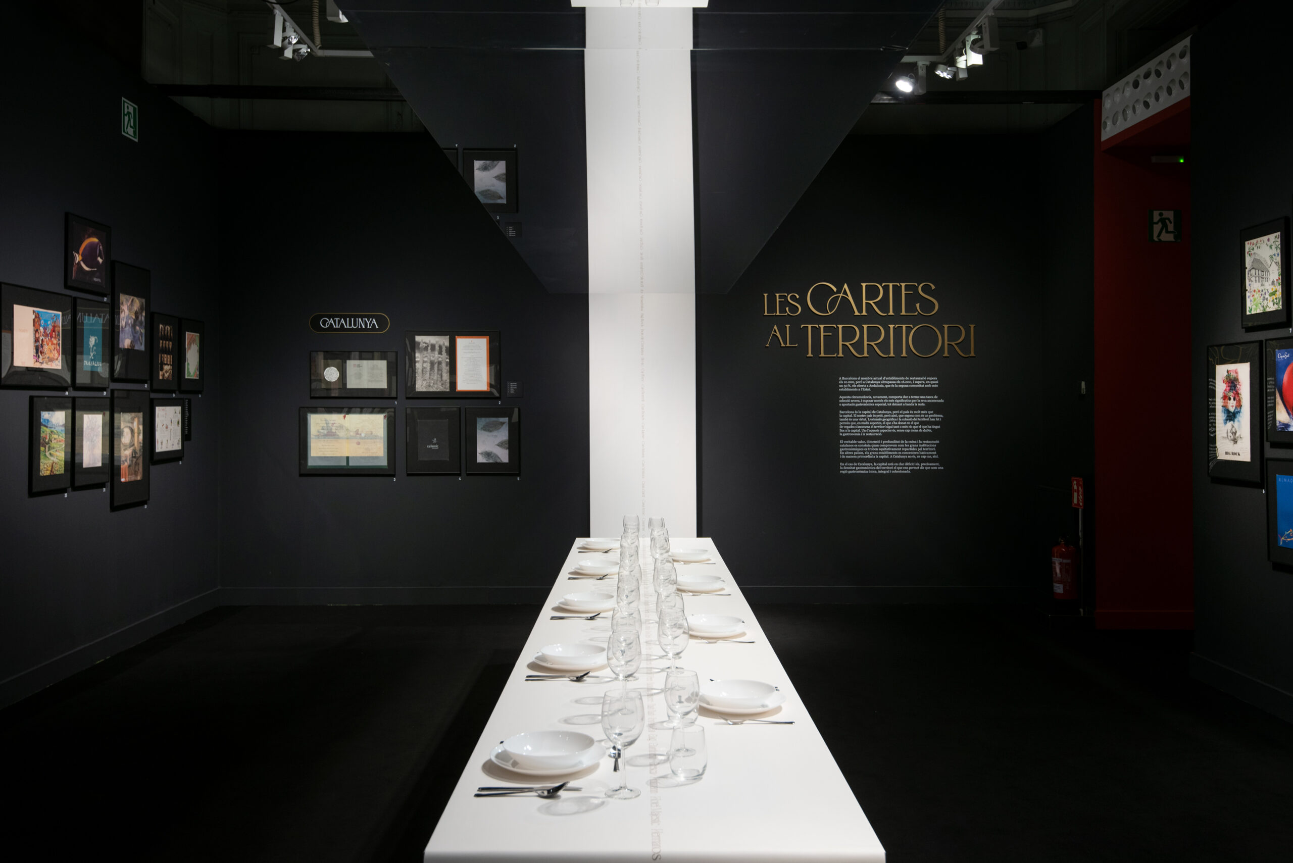 Diseño museográfico de la exposición en Palau Robert que ofrece un recorrido histórico por la gastronomía catalana mediante cartas de restaurante representativas desde principios del siglo XX hasta la actualidad.