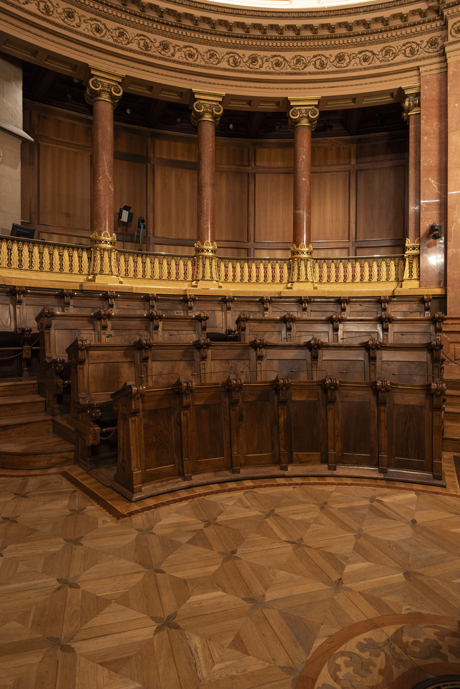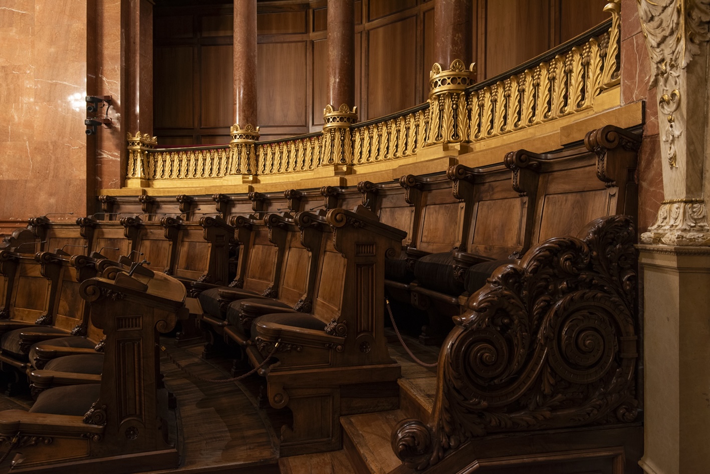 La contextualización temporal de este espacio y la conservación de los BBCC obligaron a respetar la integridad física de todos los elementos de fábrica y decorativos, y su uso nos llevó a diseñar dos sistemas de iluminación complementarios que funcionan dependiendo del uso concreto. En el caso de la celebración de plenos, se tuvieron muy presentes las necesidades lumínicas para la filmación con niveles de iluminancia elevados en plano vertical, mientras que, en la escena museográfica, se optó por una iluminación general más tenue para que se pudieran apreciar los elementos arquitectónicos de la sala. Además, se aplicaron los criterios de conservación, especialmente sobre el lienzo que preside el salón, la única pieza de sensibilidad media frente a la radiación.